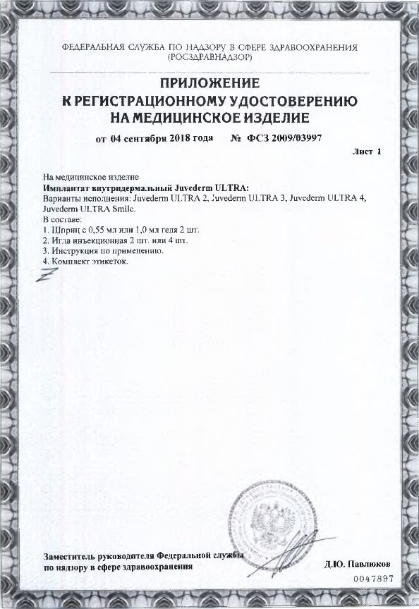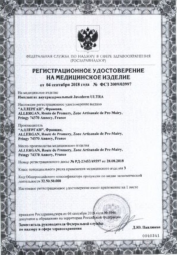 Cертификат на дистрибьюцию Juvederm Ultra 3: