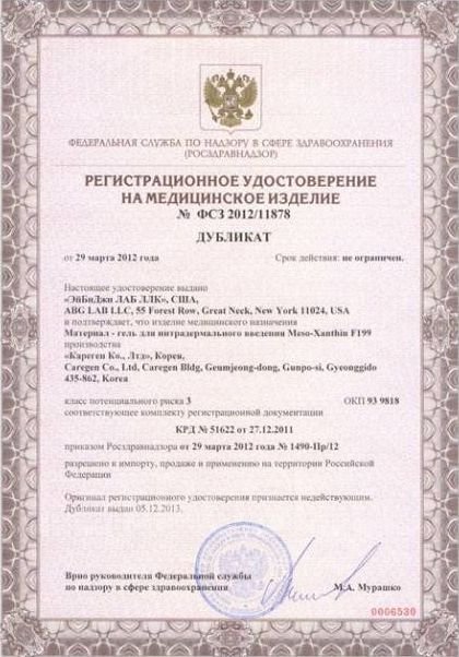 Cертификат на дистрибьюцию Meso-Xanthin F199:
