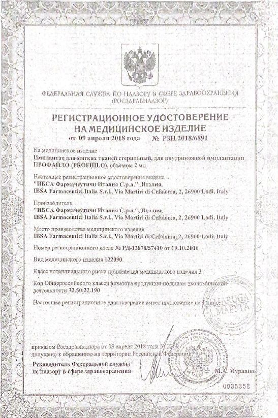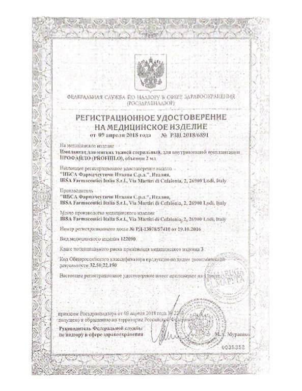 Cертификат на дистрибьюцию биоревитализант Profhilo: